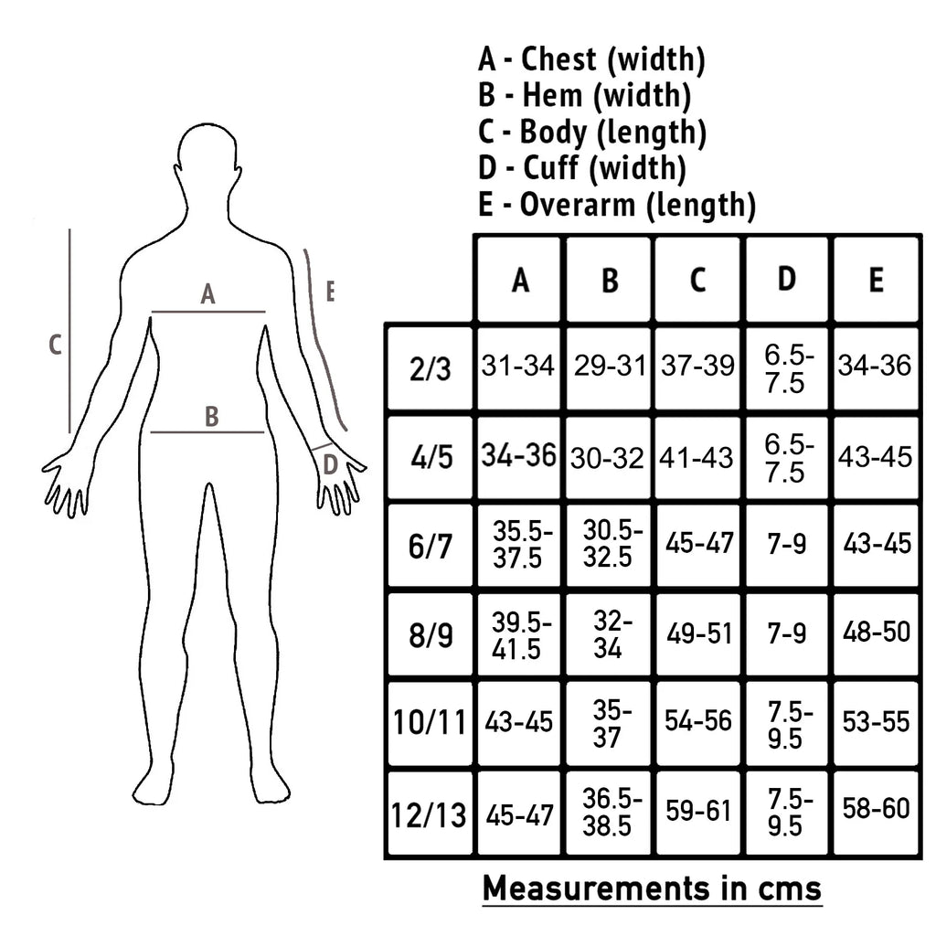 • Garment Size (Chest): 2-3yrs 25"; 4-5yrs 26"; 6-7yrs 28"; 8-9yrs 32"; 10-11yrs 34"; 12-13yrs 36"