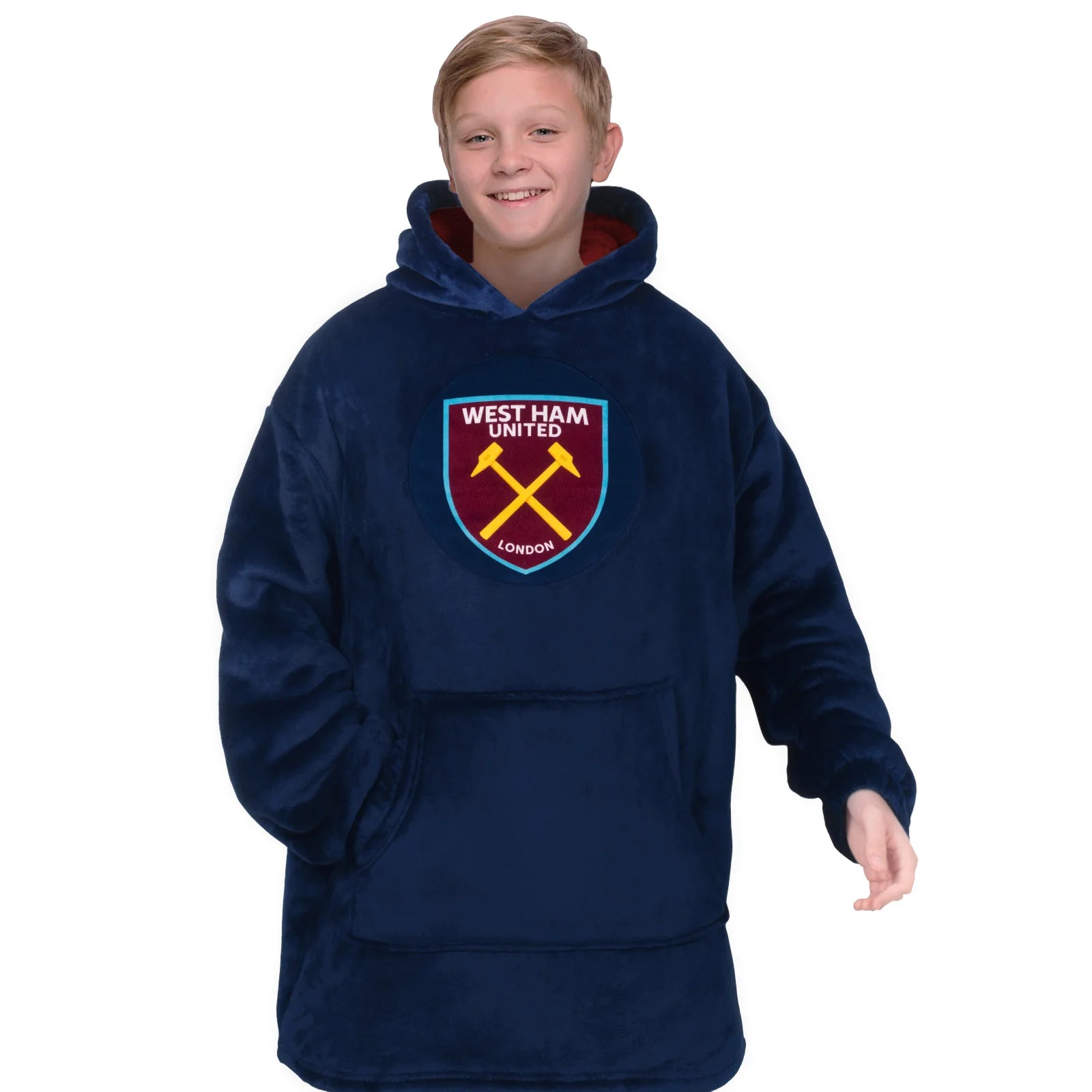 Stay warm and stylish with our officially licensed West Ham United Kids Oversized Hoodie Blanket. Made from 100% polyester and fully lined with ultra-soft sherpa fleece, this wearable blanket offers unbeatable warmth and comfort — perfect for chilly winter evenings, gaming, watching the match, or just relaxing at home. It features a large velour applique club crest proudly displayed on the chest and a spacious kangaroo pocket for added convenience. The oversized fit allows for easy movement and layering, ensuring maximum comfort. Machine washable for easy care, this West Ham United kids hooded blanket is the perfect gift for any young supporter — ideal for birthdays, holidays, or special occasions.