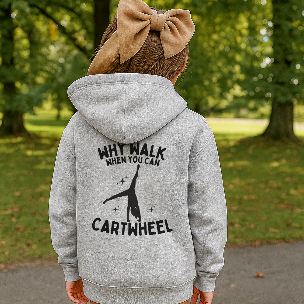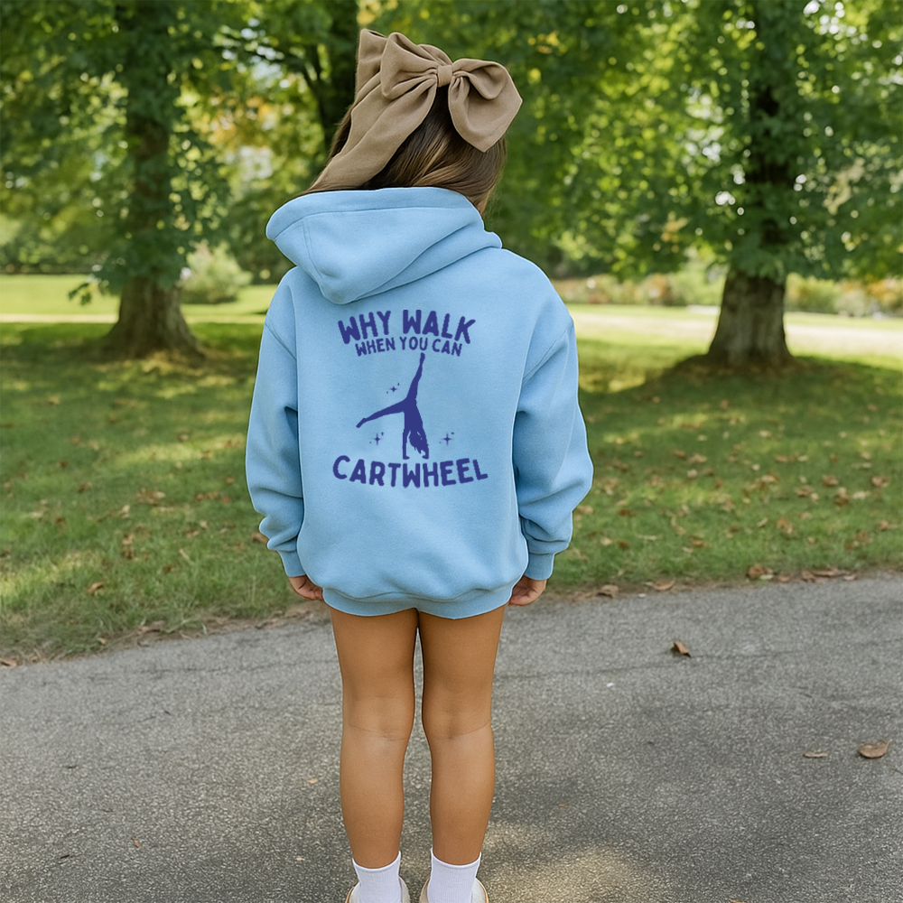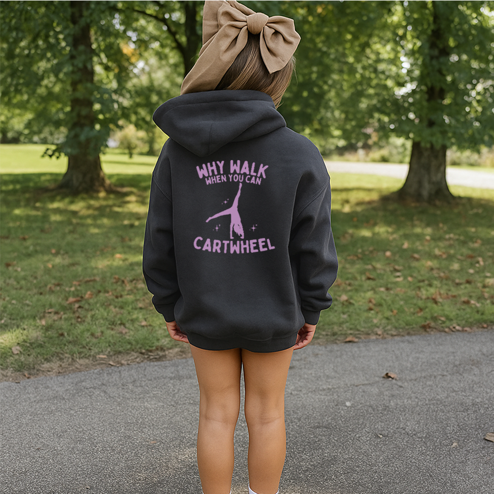 For the gymnast who’s always on the move (and usually upside down), this hoodie says it all. With its bold back graphic and comfy everyday fit, the "Why Walk When You Can Cartwheel" hoodie is perfect for practice runs, weekend chills, or beachside handstands.