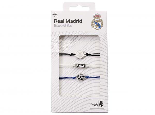 This Real Madrid friendship bracelet set is officially licensed and features the club's crest, logo, and football designs. The charms measure approximately 15mm wide and are on an adjustable cord in stylish black, blue, and white. Perfect for ages 14 and up, they come in a branded window box.