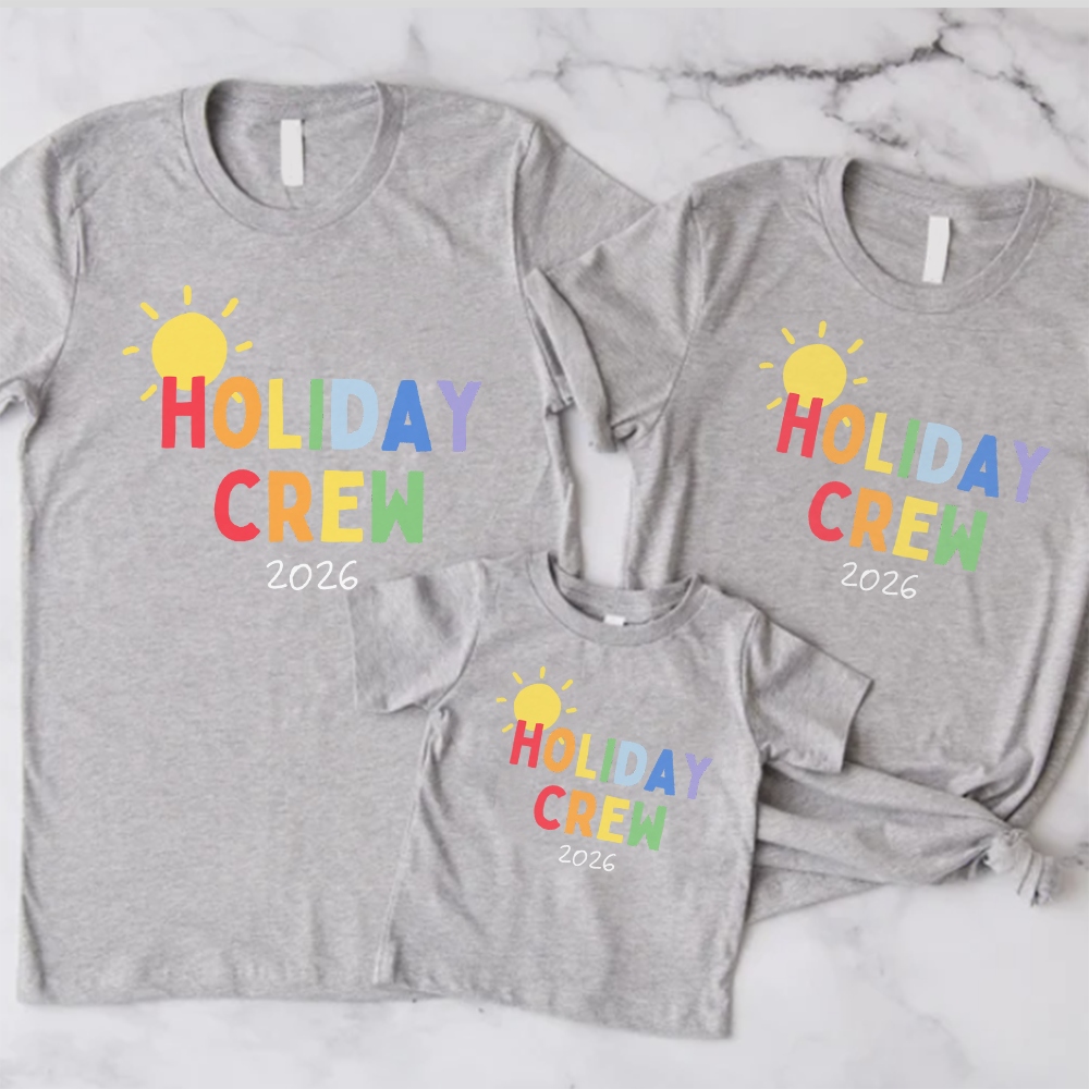 The ultimate family holiday tops are here! Featuring 'Holiday Crew 2026' slogans, these tops are perfect for travel day and available in all kid and adult size options.