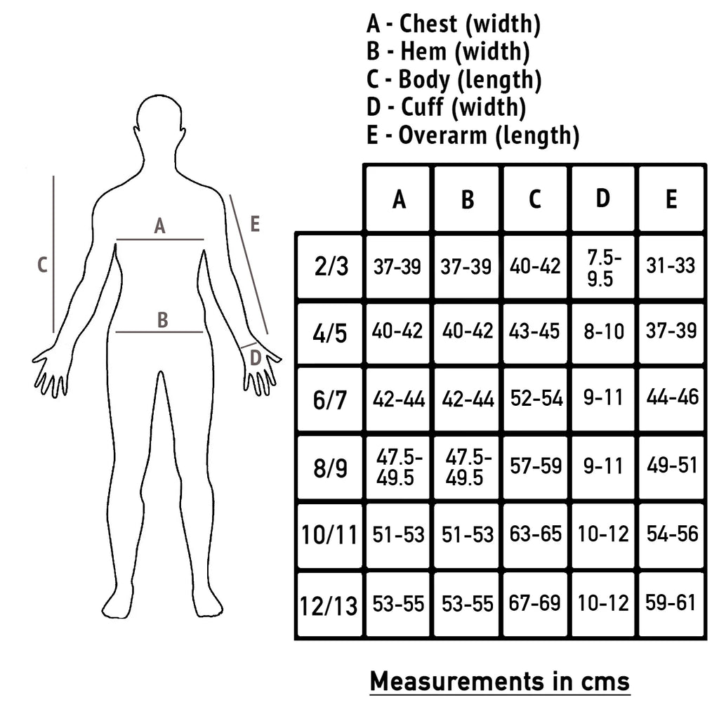 • Garment Size (Chest): 2/3yrs (28"), 4/5yrs (30"), 6/7yrs (32"), 8/9yrs (36"), 10/11yrs (38"), 12/13