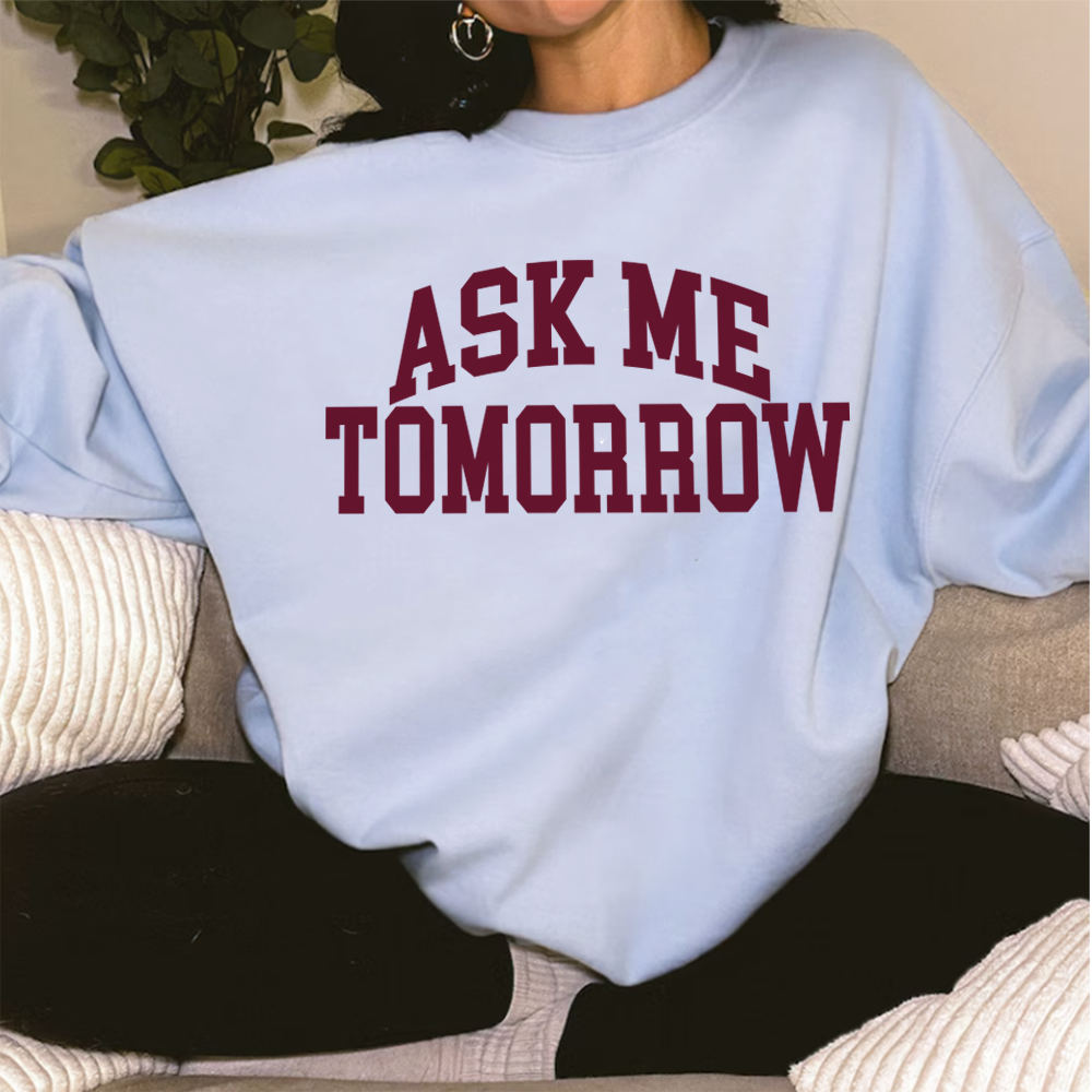 Still Tired, ask me tomorrow ... Perfect sweatshirt that says it all! Featuring graphic slogan 'Ask Me Tomorrow' this college style graphic is a great cool & casual sweatshirt for lounging around on the days you aren't feeling your best. The perfect added layer for these chiller months. Keep it cute & stylish with this all too relatable slogan!