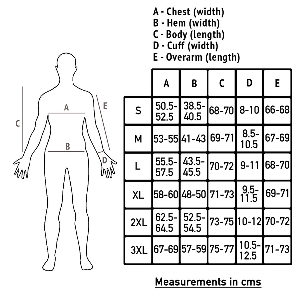 - Garment Size (Chest): Small 40"; Medium 42"; Large 43"; XL 45"; XXL 50"; 3XL 52"