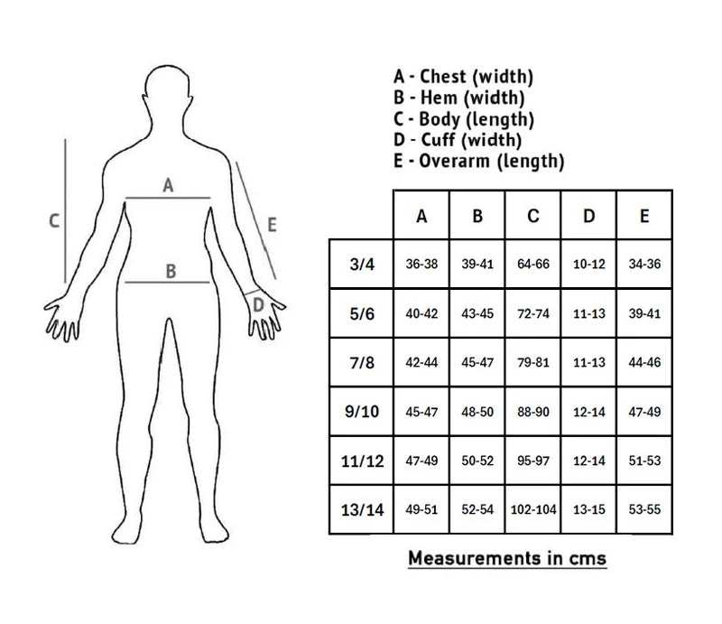 • Height: 3/4yrs 104cm; 5/6yrs 116cm; 7/8yrs 128cm; 9/10yrs 140cm; 11/12yrs 152cm; 13/14yrs 164cm