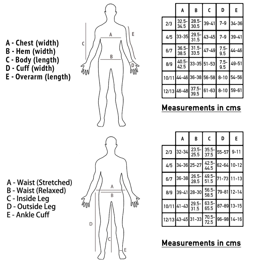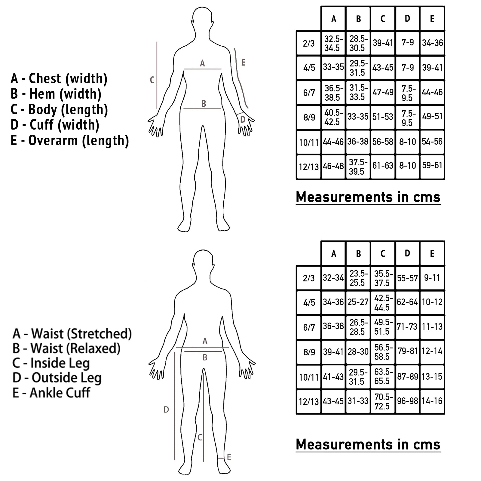 - Garment Size (Chest): 2/3 yrs 26"; 4/5 yrs 27"; 6/7 yrs 29"; 8/9 yrs 31"; 10/11 yrs 35"; 12/13 yrs 37"